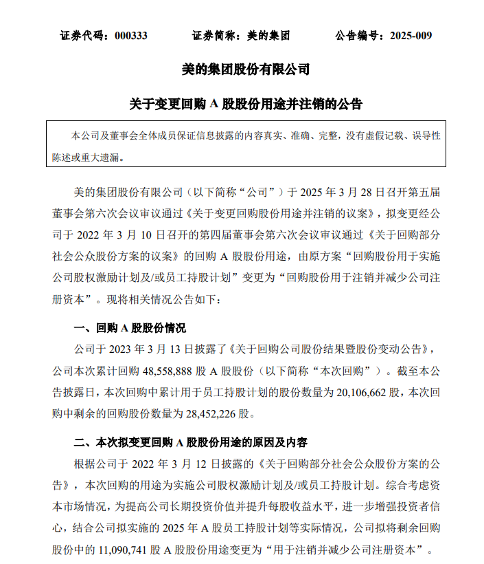 美的集團在今年3月底發佈2024年報之際,就曾公告計劃以自有資金50億元至100億元回購股份,其中70%及以上將用於註銷並減少註冊資本。若按上限實施,美的集團整體上市以來累計回購金額最高或可達400億元。