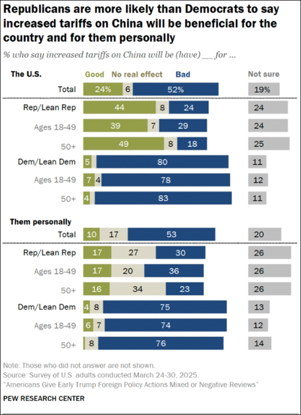 皮尤研究中心發現,儘管他們的調查在特朗普4月2日對中國商品再加徵34%的額外關税之前進行,受訪者在回答時僅考慮了特朗普此前對所有中國商品徵收的兩輪各10%的關税。就這20%的關税來説,美國人對特朗普關税更多持負面看法,認為對中國徵收關税對美國不利的人比認為此舉有利的人多得多,認為對華提高關税會給他們個人帶來不利影響的人約是認為這對他們有利的人的五倍。