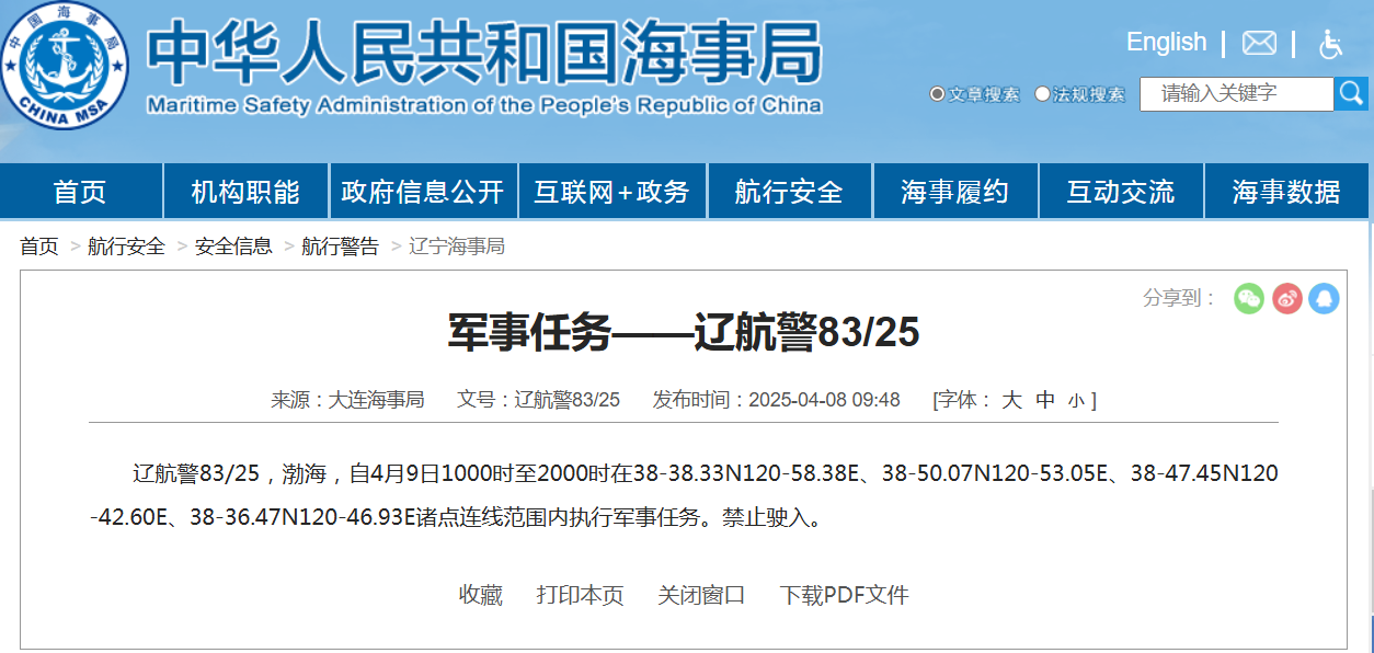 4月8日,大連海事局發佈遼航警83/25航行警告:渤海,自4月9日1000時至2000時在38-38.33N120-58.38E、38-50.07N120-53.05E、38-47.45N120-42.60E、38-36.47N120-46.93E諸點連線範圍內執行軍事任務。禁止駛入。