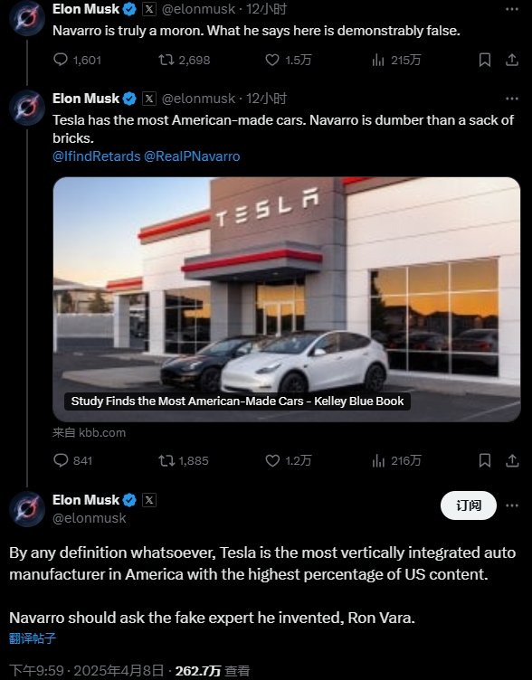 馬斯克先是轉發了納瓦羅的採訪視頻並寫道:“納瓦羅真是個傻蛋,只會滿嘴胡話。”隨後,他力證特斯拉技術一流,稱特斯拉擁有“最多美國製造的汽車”,是美國“垂直整合程度最高、美國製造零部件佔比最高”的汽車製造商,抨擊納瓦羅“蠢得不如一袋子磚頭”。