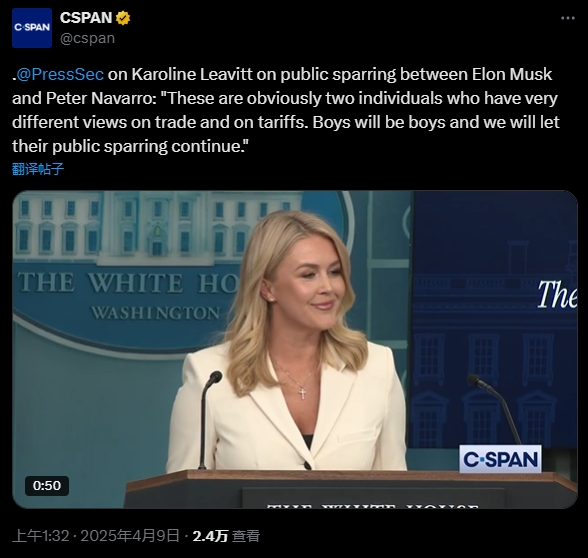 據現場視頻,談及馬斯克(53歲)和納瓦羅(75歲)的爭吵時,萊維特出來打圓場,“男孩都這樣”。