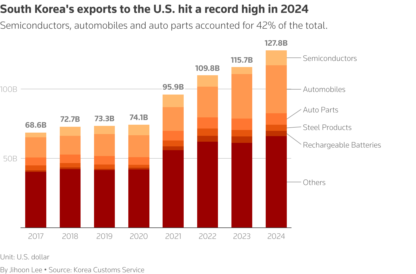 2024年,韓國對美國的汽車出口額為347億美元,佔其汽車出口總額的49%。同時,半導體、汽車以及汽車零部件三大類產品,在去年總計佔韓國對美出口總額的42%。