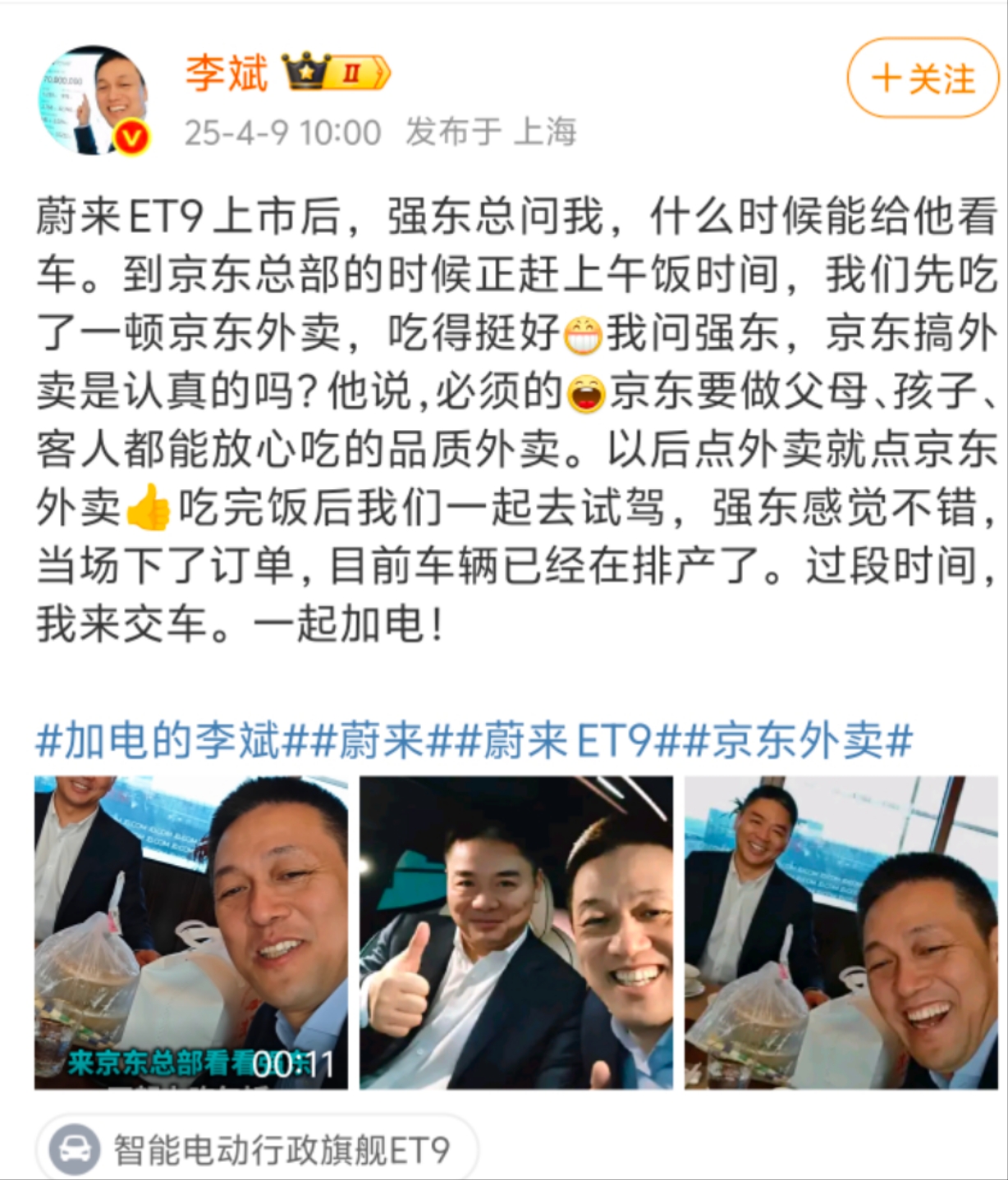 李斌在微博中配文提到:“蔚來ET9上市後,強東總問我,什麼時候能給他看車。到京東總部的時候正趕上午飯時間,我們先吃了一頓京東外賣,吃得挺好。”