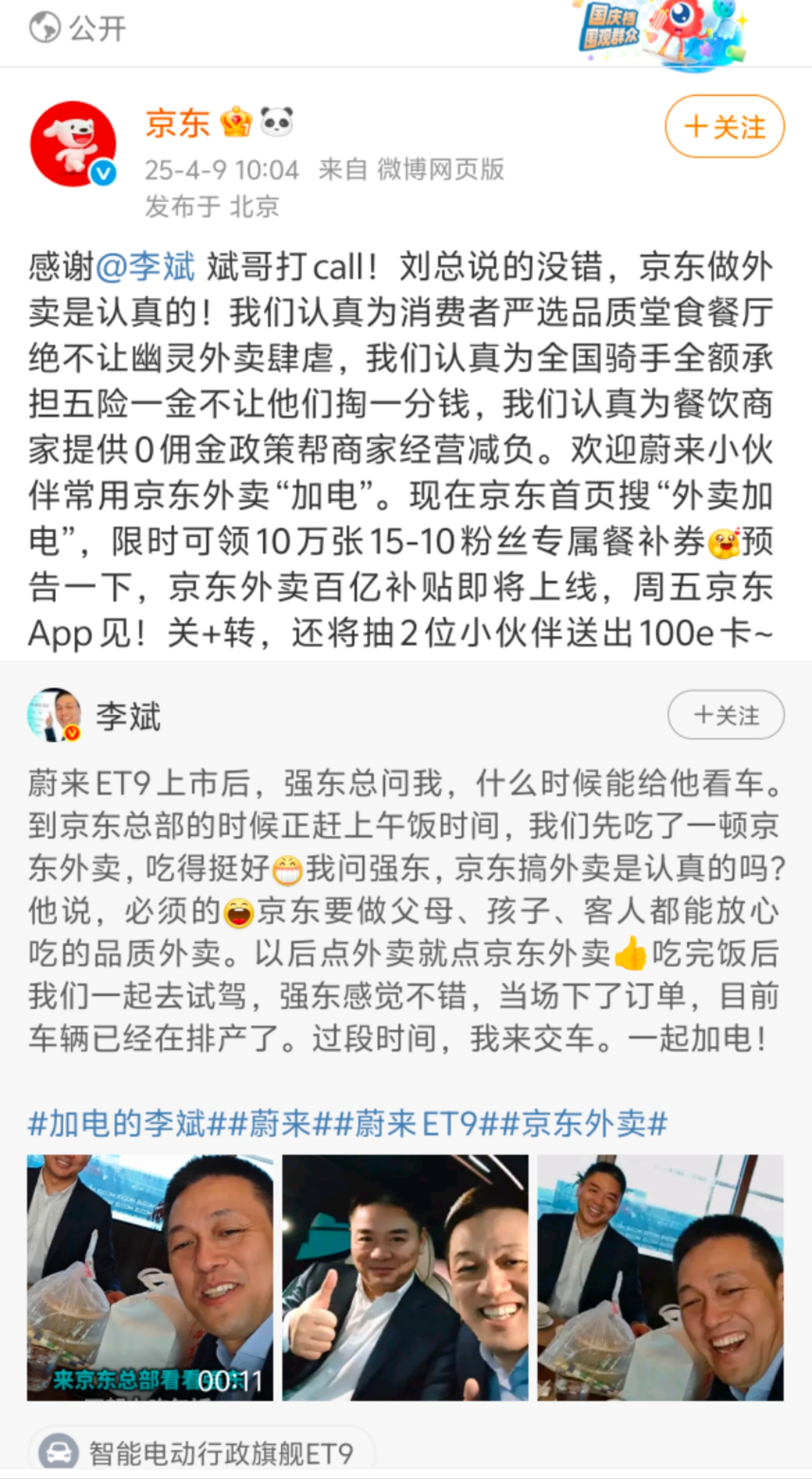 4月9日,蔚來創始人李斌 @李斌 在微博發佈和京東創始人劉強東的互動視頻,並配文,隨後“李斌和劉強東一起吃外賣”話題登上微博熱搜,引發網友關注。