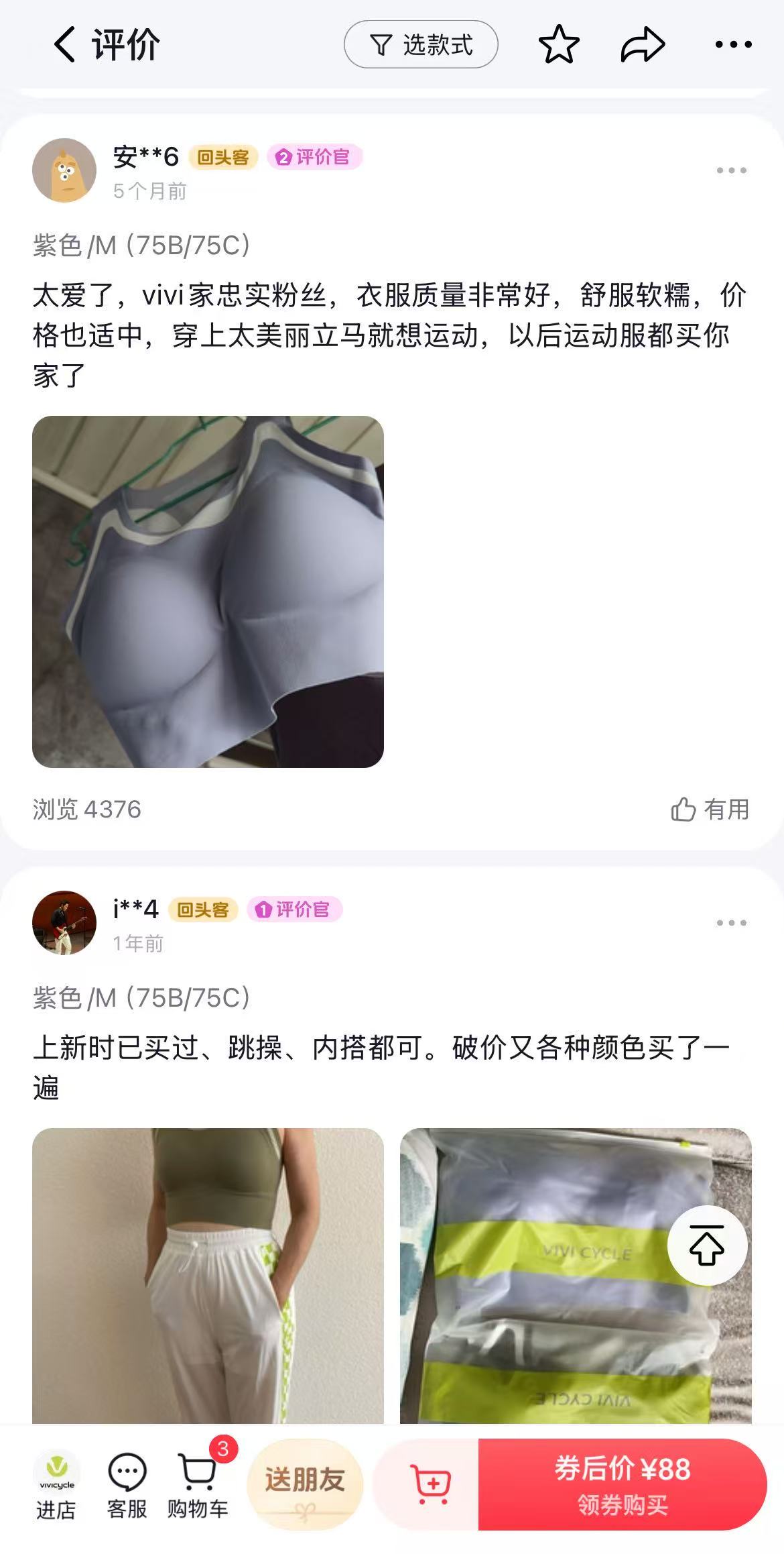 在VIVICYCLE的抖音旗艦店中,銷量TOP 4 的產品主要是運動內衣及跳操襪,售價均為88元,商品評論區中大多數消費者都是“劉畊宏女孩”,“買來和劉畊宏跳操”。