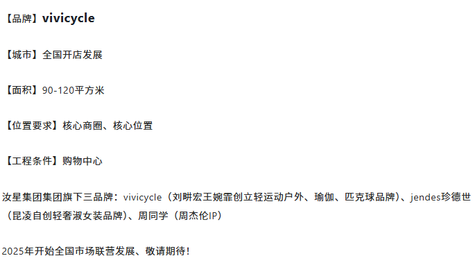 其中,汝星集團(浙江汝星品牌管理公司)負責VIVICYCLE合作方的招募。值得注意的是,這一品牌管理公司也與周杰倫的關聯極為密切,除了劉畊宏夫婦的輕運動品牌VIVICYCLE,公司旗下還有昆凌自創的輕奢淑女裝品牌“jendes珍德世”和周杰倫的個人IP“周同學”。