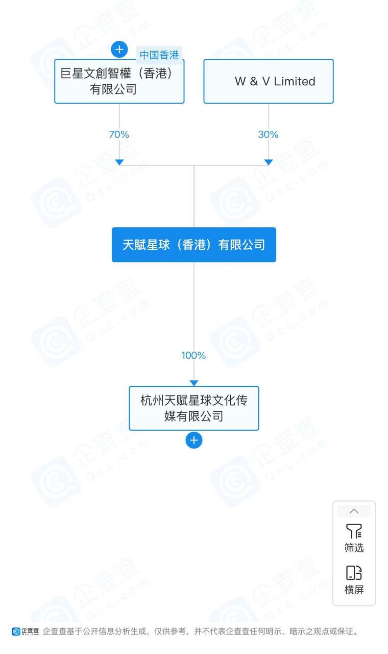 今年三月,劉畊宏與MCN無憂傳媒“分手”,轉投新MCN天賦星球。該公司(杭州天賦星球文化傳媒有限公司)由劉畊宏(W & V Limited)與周杰倫關聯的巨星傳奇集團(巨星文創智權香港有限公司)共同創立,持股比例分別為30%和70%。