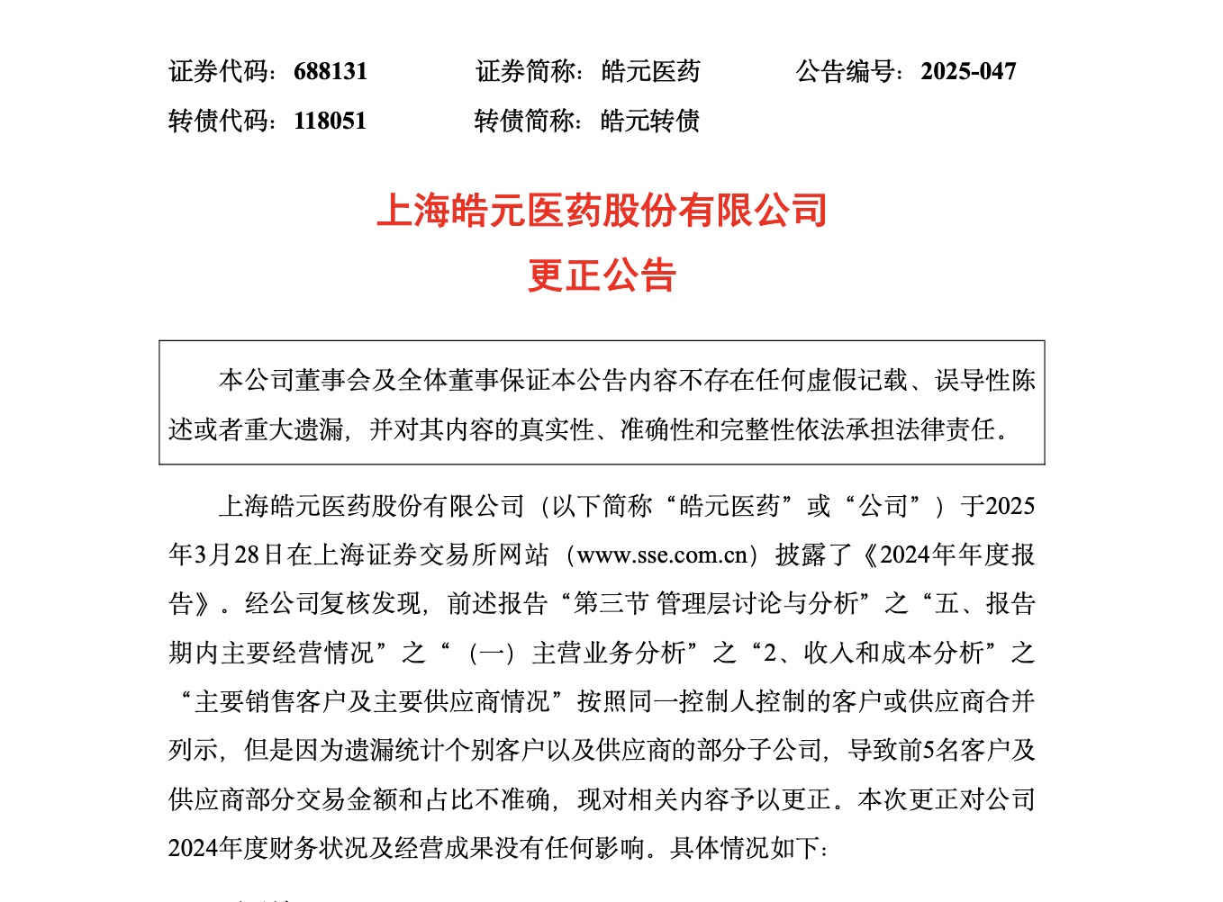 4月8日,皓元醫藥發佈年報更正公告,根據更正公告,皓元醫藥在統計前五大客户時,因"遺漏統計個別客户及供應商的子公司",導致交易金額和佔比出現顯著偏差。更正前,前五大客户銷售額為3.17億元,佔比13.98%;更正後,這一數字攀升至3.29億元,佔比14.48%。