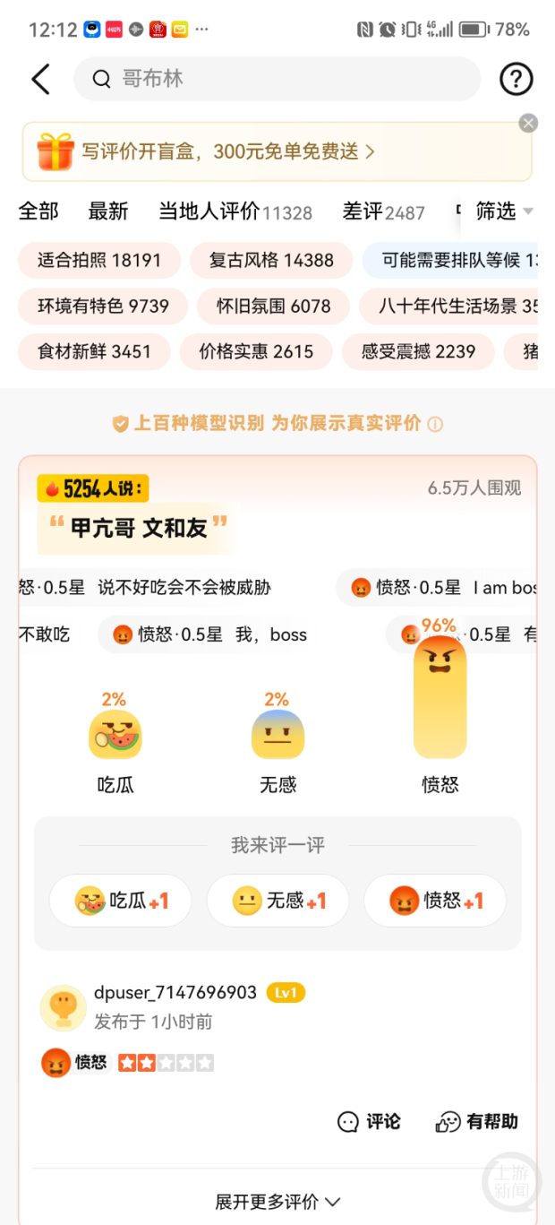 4月9日10時許,上游新聞記者登錄大眾點評查詢發現,在長沙文和友海信廣場店頁面顯示有3021人在説“I am boss”,共有5.0萬人圍觀。在下方的流動留言中,大部分網友留言“憤怒·0.5星”,還有部分網友留言“憤怒·1.5星”“憤怒·2星”。在評價欄目中,差評數量為2464條。9日12時許,記者再次查詢時看到,圍觀人數已經變為6.5萬人,5254人在説“甲亢哥 文和友”,差評數量為2487條。