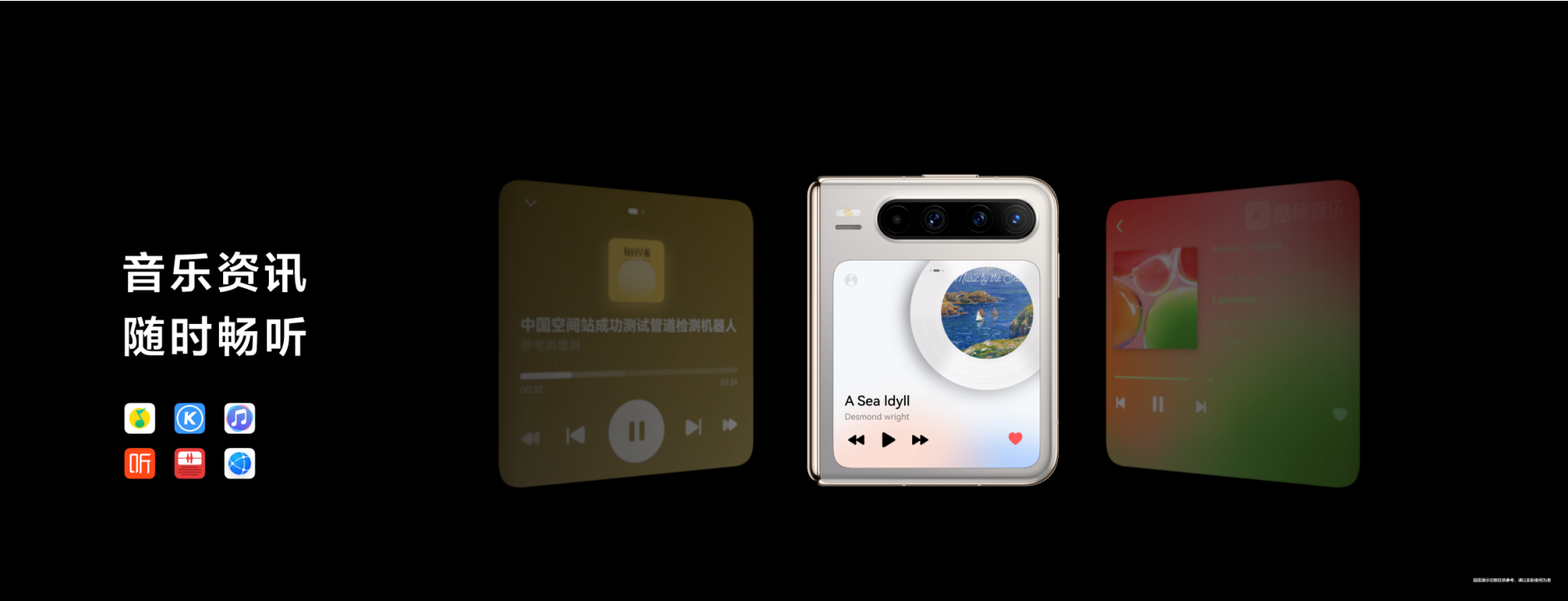 音樂新聞隨時聽,合屏也精彩:無論在通勤路上還是工作間隙,合屏狀態下用Pura X可以直接操控內容播放,包括QQ音樂、酷我音樂、華為音樂等音樂App及喜馬拉雅、蜻蜓FM等聽書App都已經完成適配,並且有精緻的播放卡片,沉浸、便捷又時尚。如果你是短視頻愛好者,用外屏刷抖音、快手也非常方便。