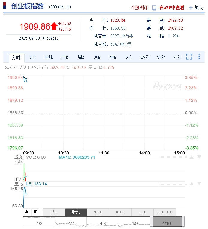 4月10日,三大股指高開,滬指漲1.29%,深成指漲2.29%,創業板漲3.35%。消費電子概念股大幅反彈,立訊精密、朝陽科技競價漲停,歌爾股份、工業富聯接近漲停,藍思科技、安克創新等漲超10%。
