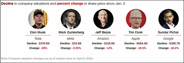 據美國有線電視新聞網(CNN)9日報道,自今年年初以來,Meta公司首席執行官(CEO)扎克伯格、蘋果公司CEO蒂姆·庫克、字母表公司(Alphabet,谷歌母公司)CEO桑達爾·皮查伊、特斯拉CEO埃隆·馬斯克和亞馬遜創始人傑夫·貝索斯,創立或運營的公司的市值累計蒸發近1.8萬億美元,即使在特朗普9日宣佈對大部分國家暫停徵收“對等關税”後,股市有所反彈。這些公司領導人的個人財富也因此縮水。