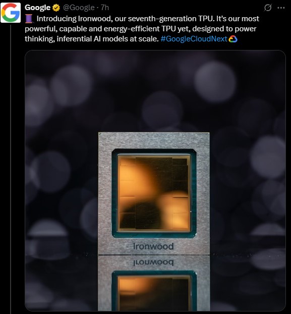 4月9日,在拉斯維加斯舉辦的 Google Cloud Next 25 大會上,谷歌推出了第七代TPU---Ironwood。該芯片專為支持大規模思考和 AI 推理模型設計,是谷歌迄今為止性能最強的TPU。