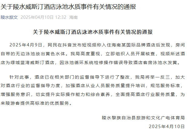 4月10日,海南陵水黎族自治縣旅遊和文化廣電體育局微信公眾號“陵水旅文”發佈關於陵水威斯汀酒店泳池水質事件有關情況的通報: