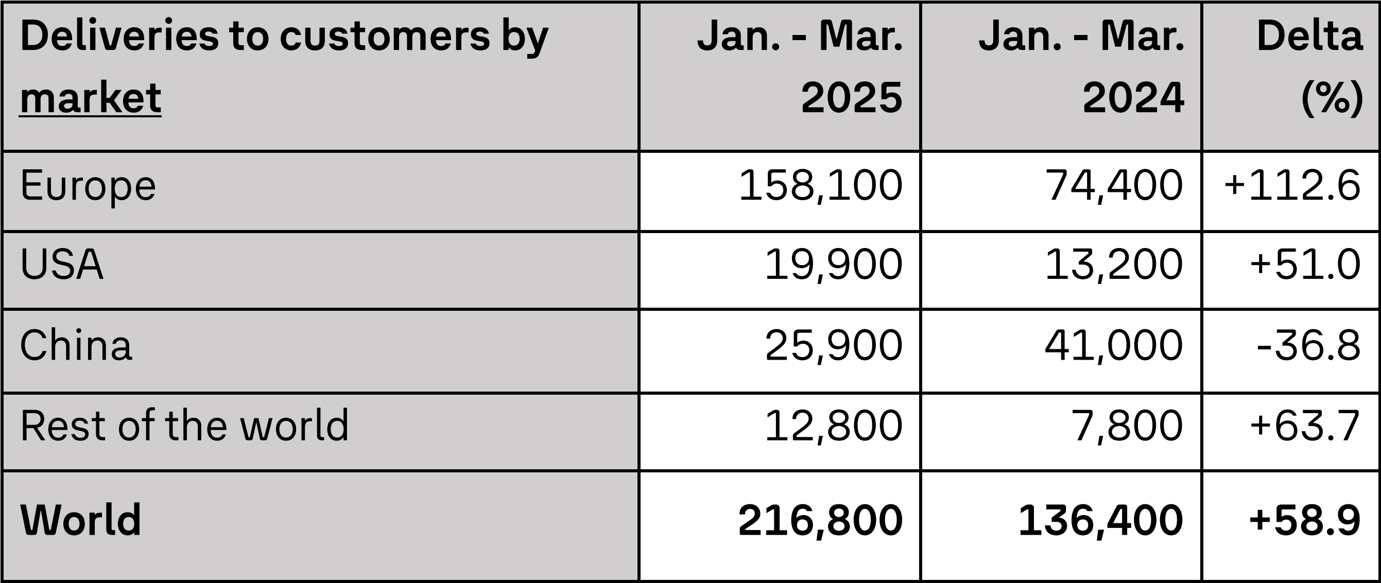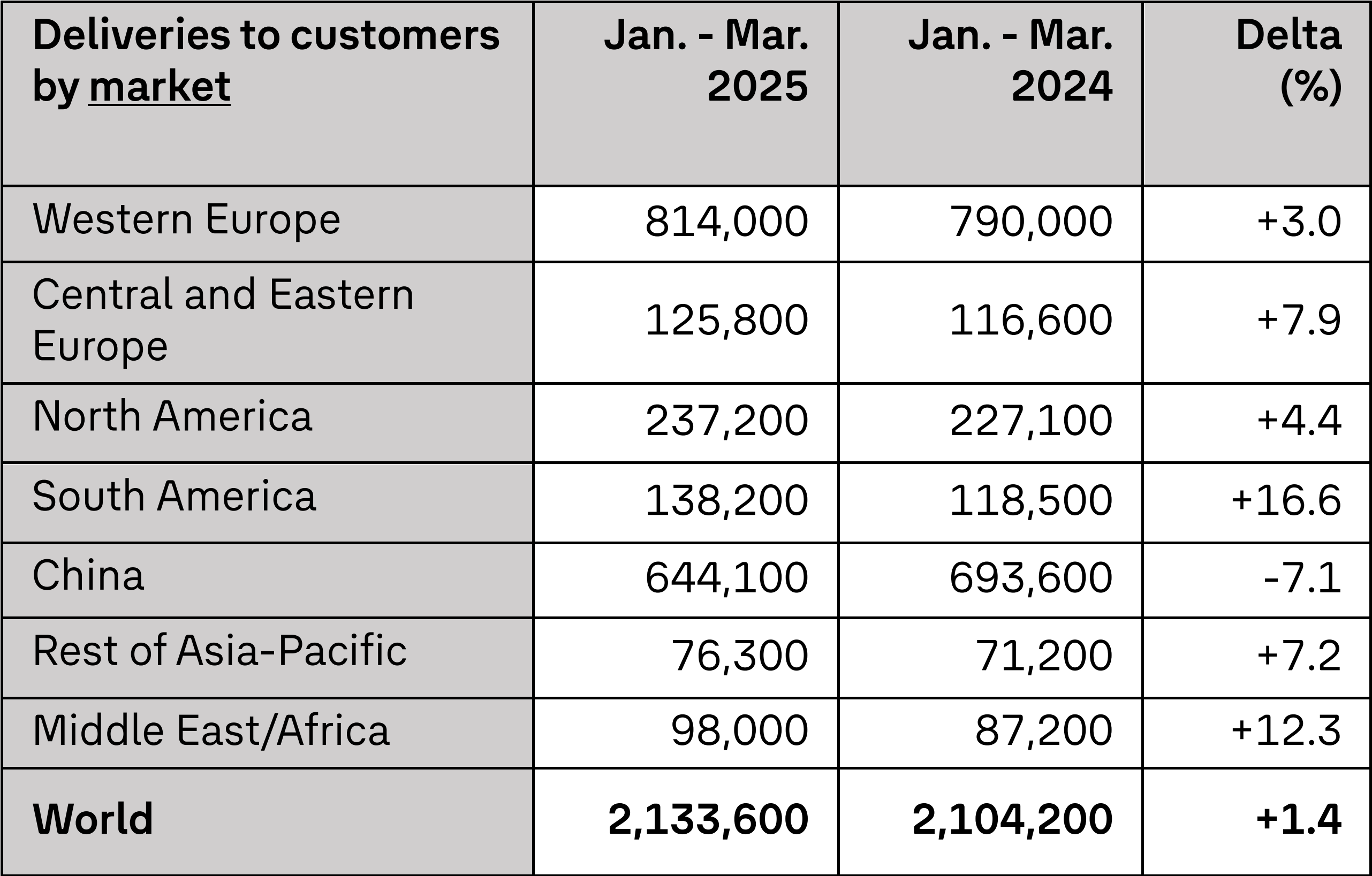 統計所有能源形式,大眾汽車集團一季度交付量在全球大部分地區實現增長,僅在中國有所下滑。