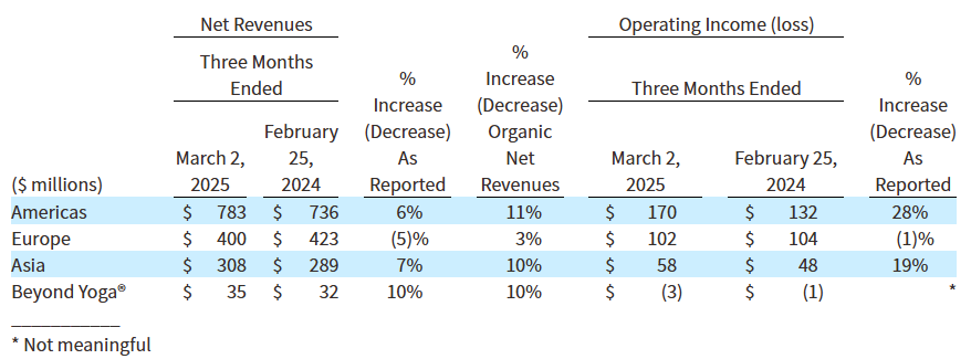 在截至2025年3月2日的第一財季, Levi Strauss & Co. 的表現好於預期。期內,公司淨收入為15億美元,較2024年同期增長3%,有機增長9%。按地區來看,美洲地區的收入為7.83億美元,較同期增長6%,有機增長11%;歐洲市場收入為4億美元,較同期下降了5%,按有機基礎計算增長3%;亞洲地區錄得3.08億美元收入,較同期增長7%,有機增長10%。