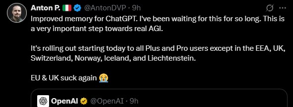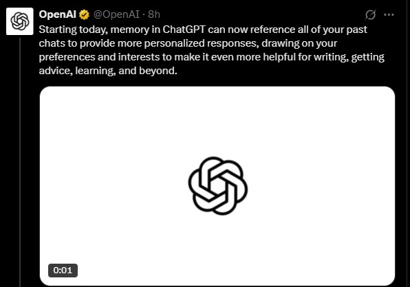 4月11日開始,ChatGPT 長期記憶功能將向除歐洲經濟區(EEA)、英國、瑞士、挪威、冰島和列支敦士登之外地區的所有ChatGPT Plus和Pro用户推出。Team、Enterprise和Edu用户也將在幾周後獲得訪問權限。