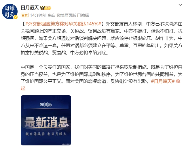 外交部回應美方稱對華關税達145%