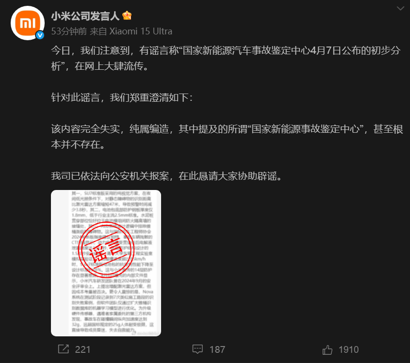 此前,網絡上有傳言稱“國家新能源汽車事故鑑定中心4月7日公佈的初步分析指出SU7設計存在問題”。對此,小米官方微博@小米公司發言人4月11日發佈聲明,稱該傳言完全失實,純屬編造。