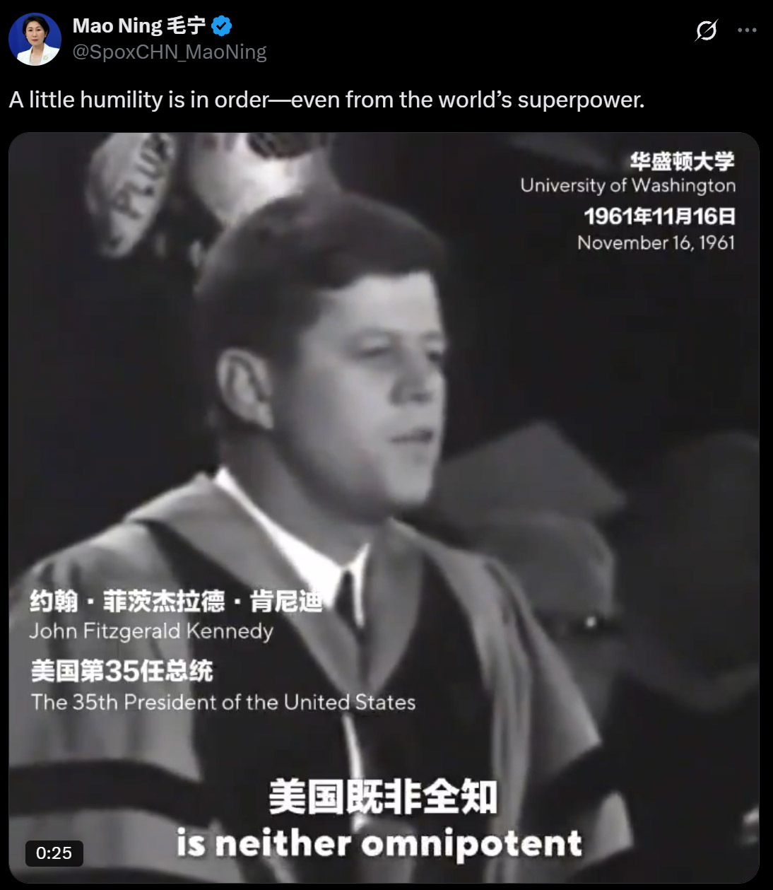 北京時間4月12日,中國外交部發言人毛寧在社交平台X上分享了一段美國前總統約翰·肯尼迪1961年在華盛頓大學的講話視頻,並配文稱,“即使作為世界超級大國,也需要保持一點謙遜。”