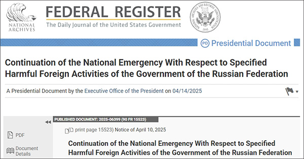 美國聯邦公報網站當地時間4月10日發佈消息稱,“根據美國《國家緊急狀態法》,繼續執行第14024號行政命令宣佈的國家緊急狀態一年。”