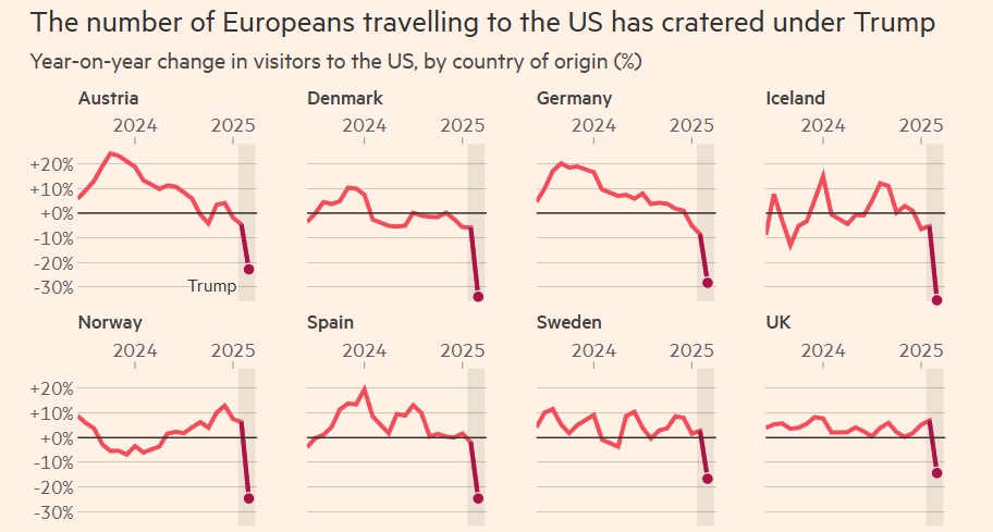 數據顯示,歐洲國家赴美旅遊人數大幅下降 《金融時報》製圖(下同)