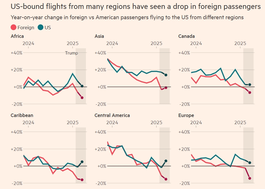 報道認為,這一趨勢對美國旅遊業構成了威脅,旅遊業佔美國GDP的2.5%。一些航空公司和酒店集團已警告稱,跨大西洋旅行的需求正在減弱,歐洲人對赴美旅遊產生了“負面情緒”。