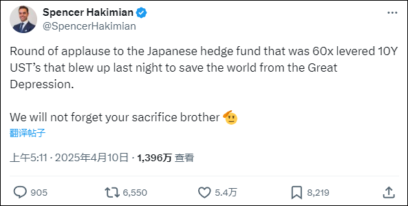 同一天,在社交媒體X平台,相關傳聞也逐漸甚囂塵上。一名資本管理公司高管高調錶示,有日本對沖基金在前一晚以60倍槓桿押注10年期美債,它的爆倉卻意外拯救了世界免於進入大蕭條的時代:“兄弟,我們不會忘記你的犧牲”。