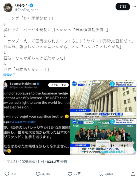 不過,晚些時候,美國媒體人率先曝出——美國的盟友日本拋售了美債。至此,相關傳聞越來越多,有市場人士稱是日本對沖基金所為。日本網友則認為,或許是此前投資失敗的一家日本對沖基金在此輪市場震盪中恐慌拋售了美債,反而“拯救了世界”,迫使特朗普暫緩徵收關税。