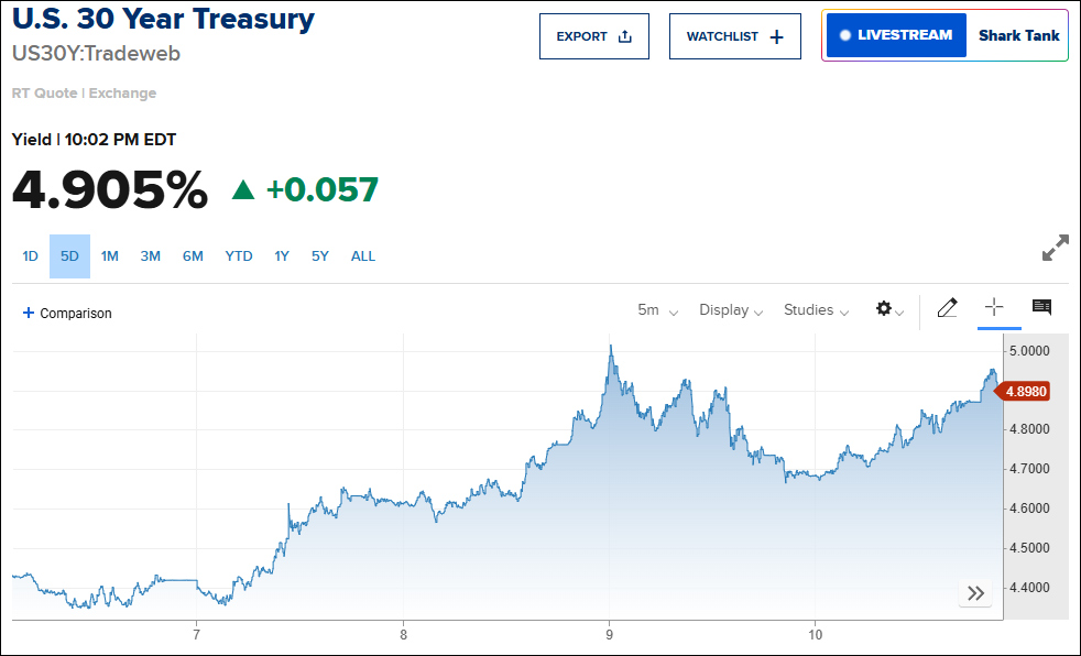當地時間4月10日,10年期美國國債收益率再度走高,最高值一度漲至4.488%。自4月4日觸底3.99%以來,10年期美國國債收益率已連續五日上漲。此外,30年期美國國債收益率也再次上升,盤中一度漲至4.957%。
