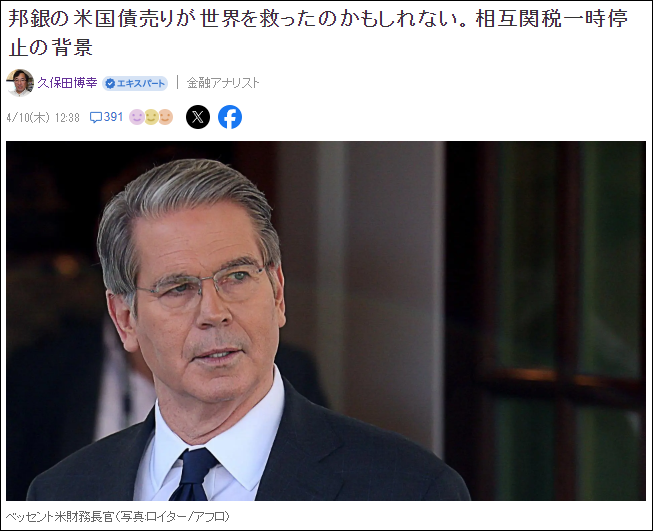 日本金融分析師撰文:日本銀行拋售美國國債或許拯救了世界 Yahoo網站截圖