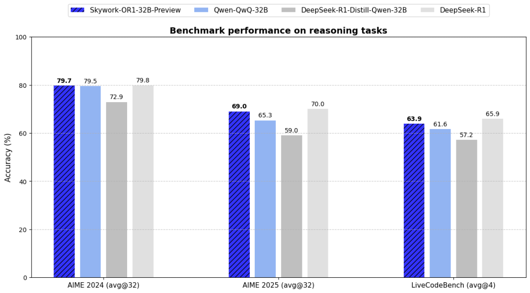 崑崙萬維稱,其中Skywork-OR1-32B-Preview在所有benchmark上均實現了對QwQ-32B的超越,並在更難的AIME25上基本與R1持平。同時,其代碼生成與問題求解能力已接近DeepSeek-R1(參數規模高達671B)。