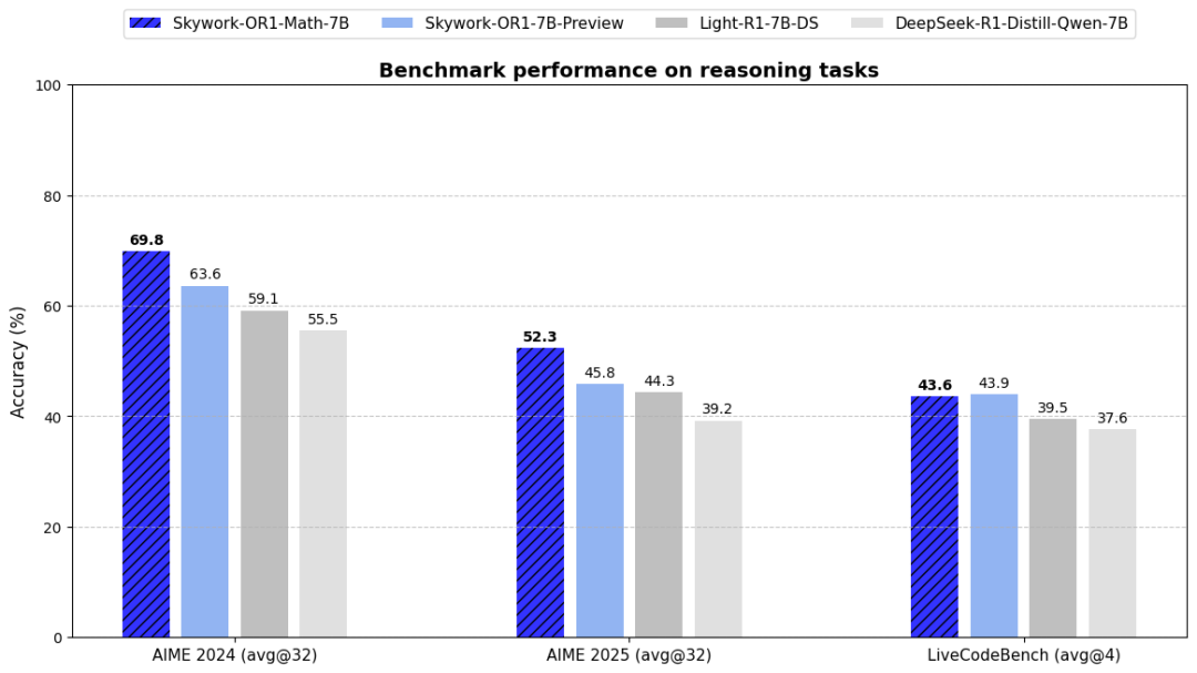此次開源涵蓋三款高性能模型,包括:Skywork-OR1-Math-7B:聚焦數學領域的專項模型,同時也具有較強的代碼能力。Skywork-OR1-7B-Preview:融合數學與代碼能力、兼具通用性與專業性的通用模型。Skywork-OR1-32B-Preview:面向更高複雜度任務、具備更強推理能力的旗艦版本。