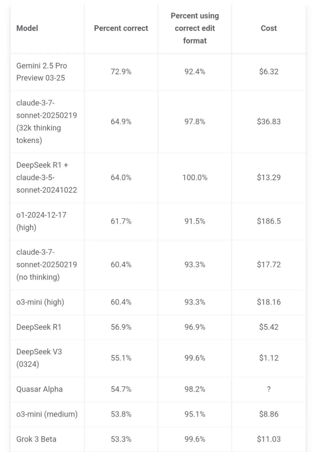 谷歌Gemini 2.5 Pro成為Aider Polyglot(真實世界編碼)性能最高的模型,並且成本低廉,僅僅比DeepSeek R1成本高一點。(AI寒武紀)