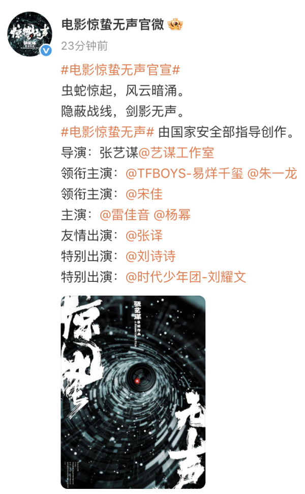 該影片由國家安全部指導創作,張藝謀執導,易烊千璽、朱一龍、宋佳領銜主演,上演一場諜戰前沿正反力量的驚心對決,一眾實力演員齊聚,創新展現新時代隱蔽戰線的無聲較量,深入反映國家安全機關護航強國建設、民族復興偉業的勇毅擔當。
