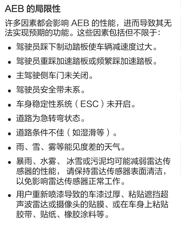 但其在侷限性一欄中顯示,駕駛員踩下制動踏板使車輛減速過大、駕駛員重踩踏板或頻繁踩加速踏板、駕駛員未系安全帶等行為可能導致影響AEB性能。