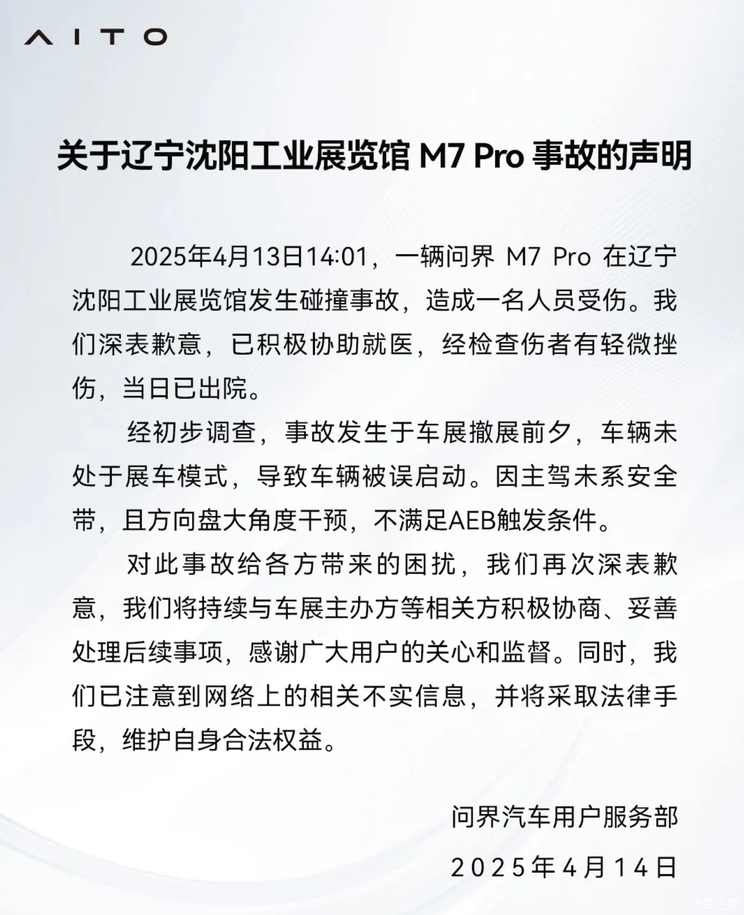 4月14日,問界汽車通過官方渠道正式回應遼寧瀋陽工業展覽館發生的車輛碰撞事故。