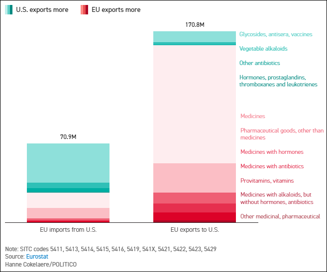 2024年,歐盟從美國進口的各類醫藥產品數量以及美國從歐盟進口的各類醫藥產品數量(以公斤為單位)。 Politico EU