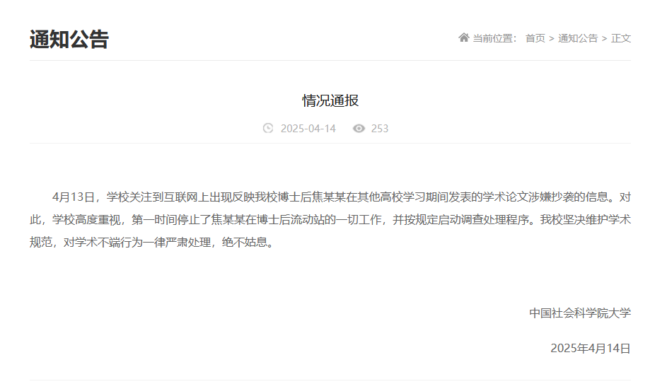 4月13日,學校關注到互聯網上出現反映我校博士後焦某某在其他高校學習期間發表的學術論文涉嫌抄襲的信息。對此,學校高度重視,第一時間停止了焦某某在博士後流動站的一切工作,並按規定啓動調查處理程序。我校堅決維護學術規範,對學術不端行為一律嚴肅處理,絕不姑息。