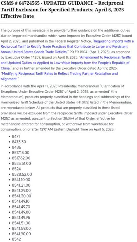 美東時間4月12日,特朗普豁免了豁免半導體、集成電路、手機和平板電腦等東西。大家都很關心,這個豁免是不是包含中國,到目前為止白宮還沒有進行非常清晰的表態。根據豁免令中列出的海關税則號分為兩類,8字開頭的是物品類型號,9字開頭的是貨品來源地號,就是貨品產地號。