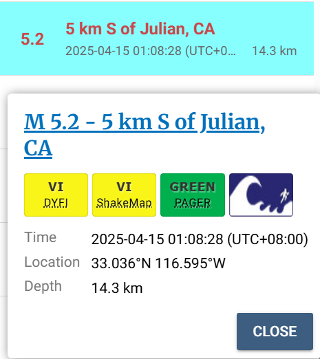 美國地質調查局地震信息網監測的結果顯示,此次地震發生於當地時間上午10時8分,震中位於加州聖迭戈郡郡朱利安地區以南約5公里處。此次地震震源相對較深,位於地表以下14.3公里。在此次地震發生之前,當地於13日下午曾發生過一次3.3級前震。