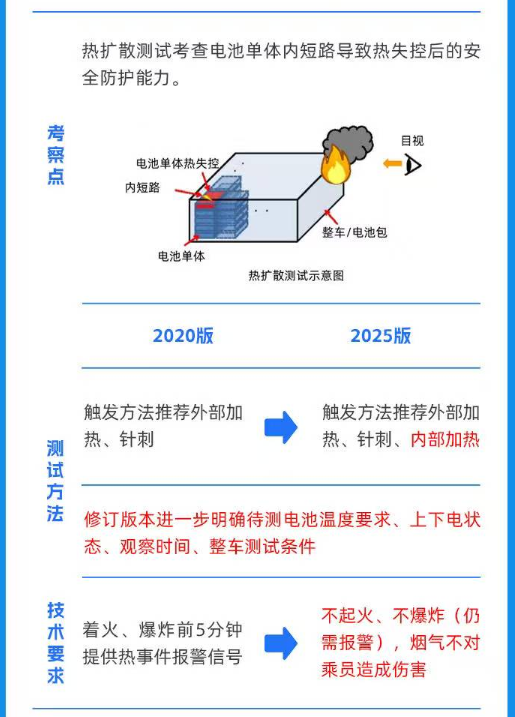 新標準中包括7項單體測試,17項電池包或系統測試等內容,包括新增電池底部撞擊測試、快充循環後安全測試等,加強熱擴散等安全要求。