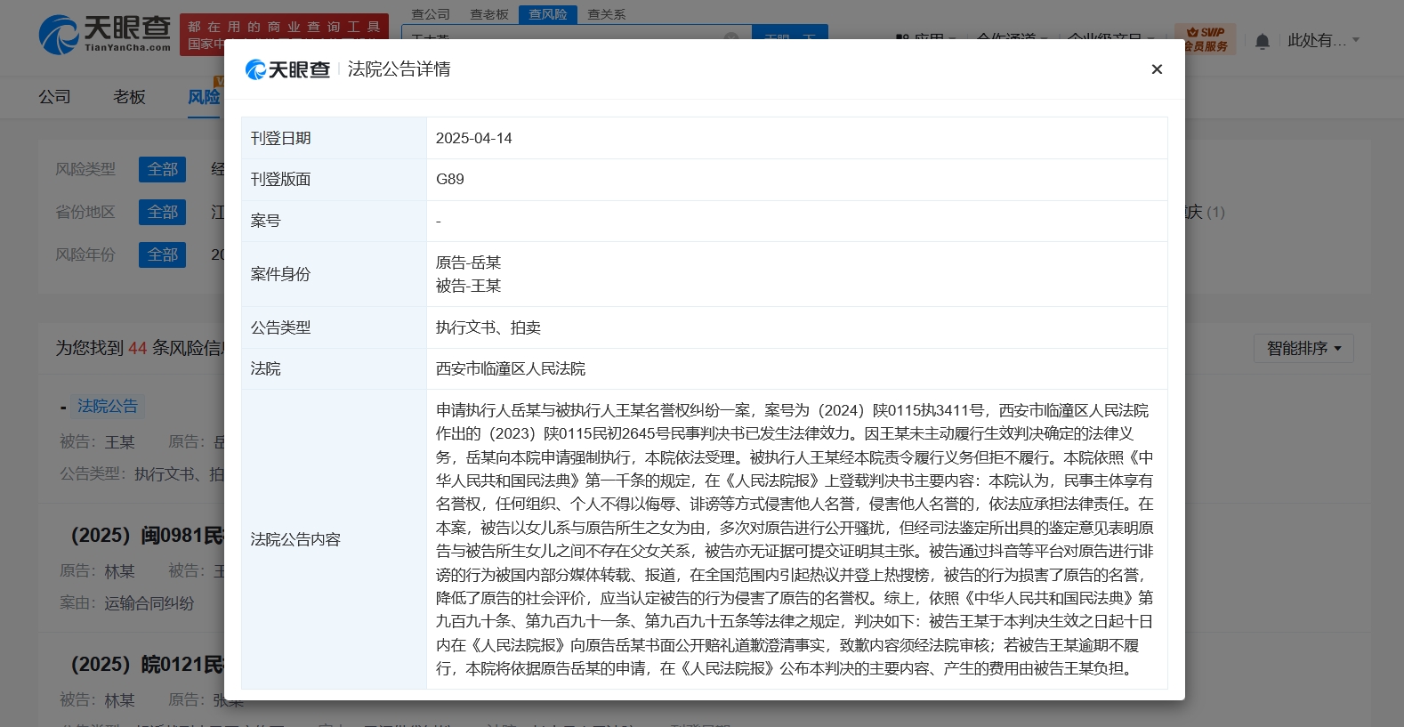 據天眼查法律訴訟信息顯示,近日,西安市臨潼區人民法院公告送達嶽龍剛(岳雲鵬)與王某名譽權糾紛一案判決書。
