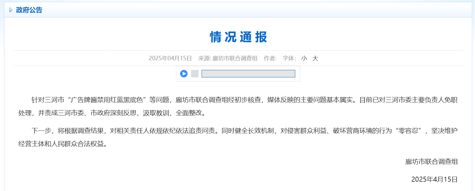 針對三河市“廣告牌匾禁用紅藍黑底色”等問題,廊坊市聯合調查組經初步核查,媒體反映的主要問題基本屬實。目前已對三河市委主要負責人免職處理,並責成三河市委、市政府深刻反思,汲取教訓,全面整改。