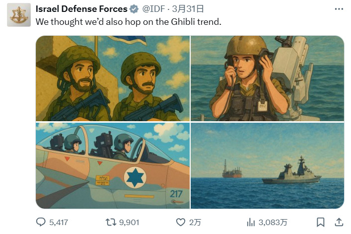 一些政府機構也參與其中,使用ChatGPT生成的吉卜力風格圖像宣傳其政治議程。美國白宮的X賬號發佈了一張吉卜力風格的圖像,內容是美國官員逮捕了一名來自多米尼加的非法移民。以色列國防軍也宣稱要“加入吉卜力浪潮”,發佈了吉卜力風格的以軍士兵圖像。