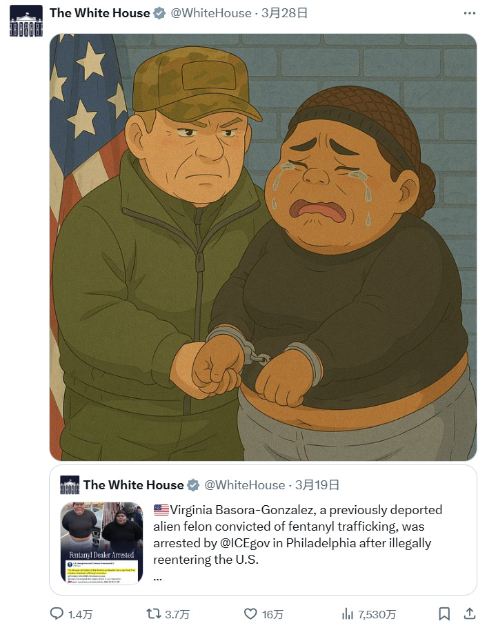 美國白宮在X平台發佈的吉卜力風格圖像