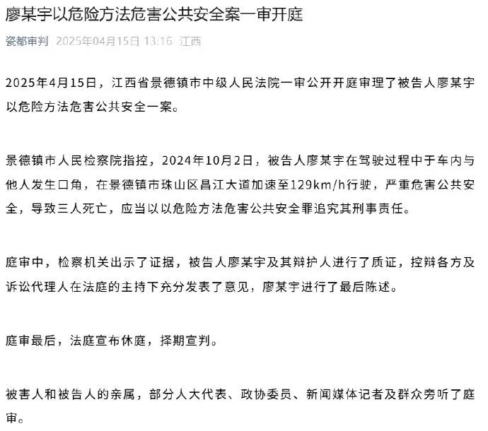 4月15日,江西省景德鎮市中級人民法院一審公開開庭審理了被告人廖某宇以危險方法危害公共安全一案。景德鎮市人民檢察院指控,2024年10月2日,被告人廖某宇在駕駛過程中於車內與他人發生口角,在景德鎮市珠山區昌江大道加速至129km/h行駛,嚴重危害公共安全,導致三人死亡,應當以以危險方法危害公共安全罪追究其刑事責任。庭審中,檢察機關出示了證據,被告人廖某宇及其辯護人進行了質證,控辯各方及訴訟代理人在法庭的主持下充分發表了意見,廖某宇進行了最後陳述。庭審最後,法庭宣佈休庭,擇期宣判。