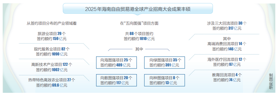 **在簽約環節,大會共簽約項目265個,總簽約額約2336億元。**其中,在上午的綜合推介大會上,簽約重點項目55個,簽約額約1540億元。當天下午,同步舉辦了8場產業專場招商對接洽談會,分別聚焦高新技術、航天、低空經濟、熱帶特色高效農業、旅遊文體、深海、綠色低碳、現代服務業等重點領域,並結合“鏈長制”實施精準招商。