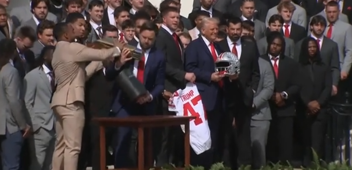 據報道,當天,特朗普、俄亥俄州立大學七葉樹隊教練戴(Ryan Day)和萬斯於白宮南草坪發表講話後,畢業於俄亥俄州立大學的萬斯試圖高舉獎盃。