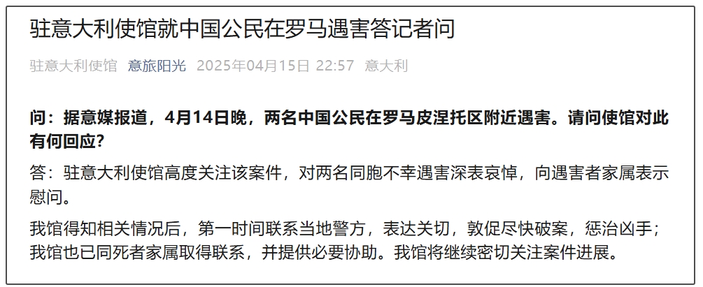 **答:**駐意大利使館高度關注該案件,對兩名同胞不幸遇害深表哀悼,向遇害者家屬表示慰問。